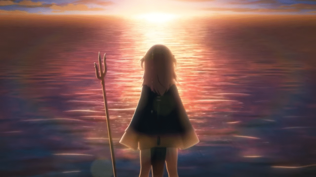 最後一幕,Gura已置身於夢幻般的深海世界。珊瑚、魚群、光影繽紛交織,像是在迎接她回家。她手握三叉戟,臉上帶著平靜的微笑,自在地穿梭其中,彷彿在說,我回來了。