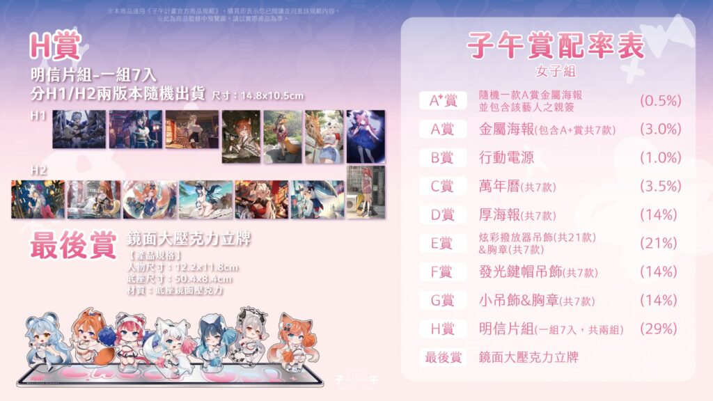 舉例來說,男團一番賞的小賞明信片組、吊飾與胸章組、相框磁鐵等三類,中籤率佔比就佔了84%,且每抽400元並不便宜,對照日本動漫一番賞,或者日本VTuber團體一番賞,單價高出不少。
